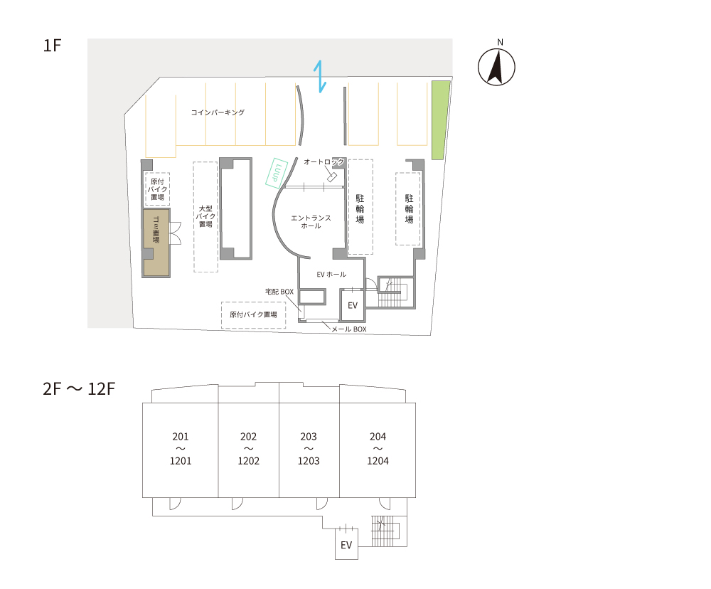 新御堂筋から一本東へ入ったところにある、スタイリッシュな鉄筋コンクリート造12階建てのマンションです。エントランスを入った先は都会の喧騒を忘れる憩いの空間をイメージした共用空間がひろがります。