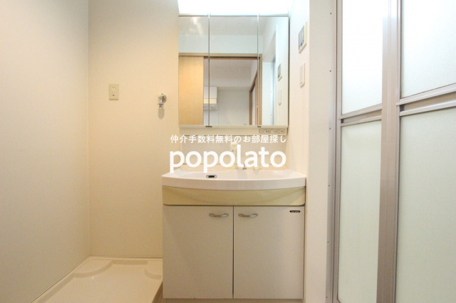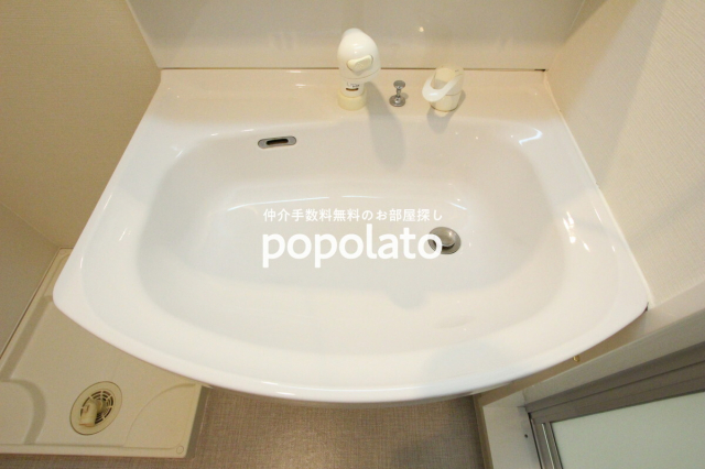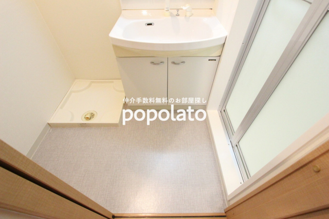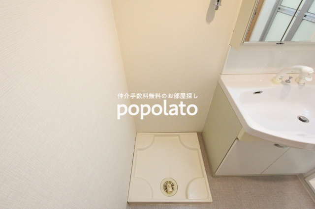 洗面所には、鏡裏収納のある大きな洗面台、洗濯機パンがあります。
