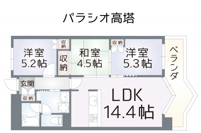 洋室は5.2帖と5.3帖の2部屋で、寝室や子ども部屋、ワークルームなど生活に合わせて配置がしやすいサイズ感。