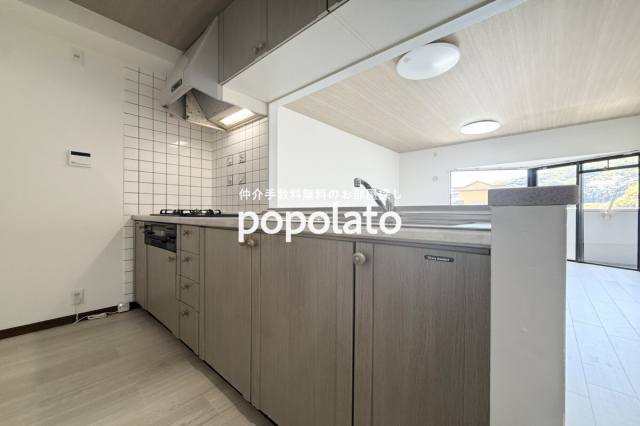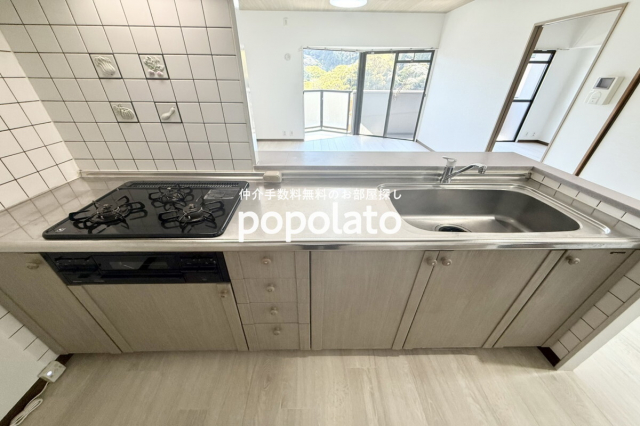 キッチンはシステムキッチン・カウンタータイプで、調理がしやすく、リビング側とのつながりも良いのが魅力。